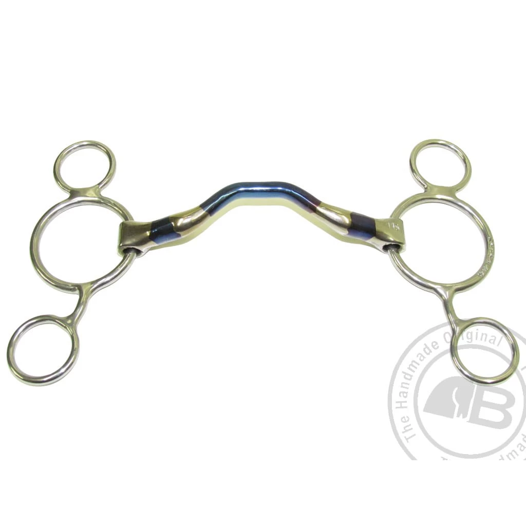The Tom Thumb is similar to the Ring bits or Dutch Gags and introduces poll pressure as well creating leverage on the mouthpiece. The main difference however is that instead of the additional rings at the bottom it has an extended shank with a ring on the end, this shank is bent and set to run at 45° the effect this has is to ease up the poll pressure and leverage on the mouthpiece.