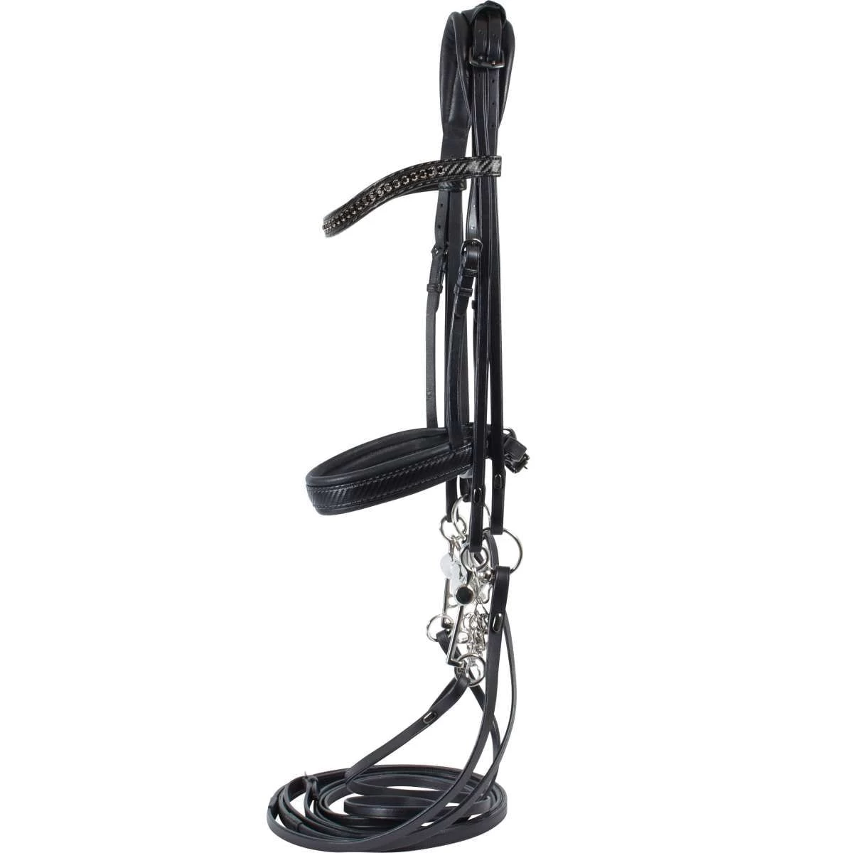 Elegant bride made from Italian quality leather in croco style. The bride has cuff buckles in dark oxidised steel and fine shiny stones in the browband. Flash noseband, 3,5cm wide, with extra padding around the mandible and pull back.