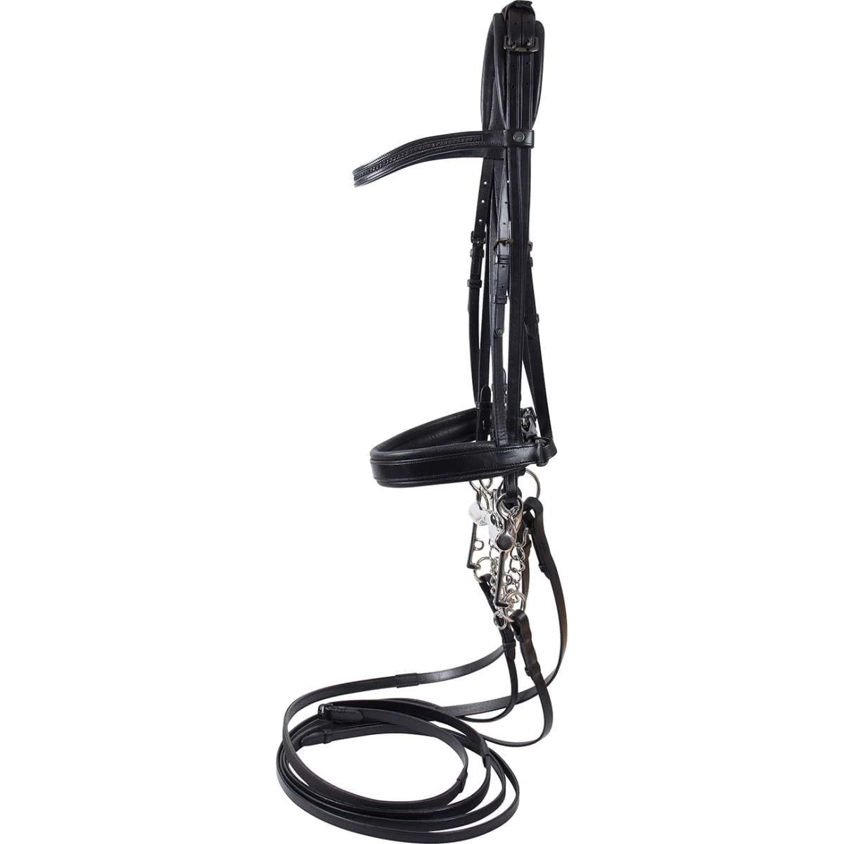 Stylish double bridle made of Italian leather with a fashionable browband that fits with all the products of our Inspire product line. 4 cm wide noseband, with extra padding around the lower jaw and pullback.Â