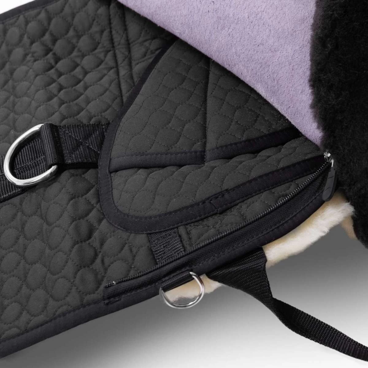 - Can be used with stirrup leathers – attach to D-rings under the lambskin seat for better balance.