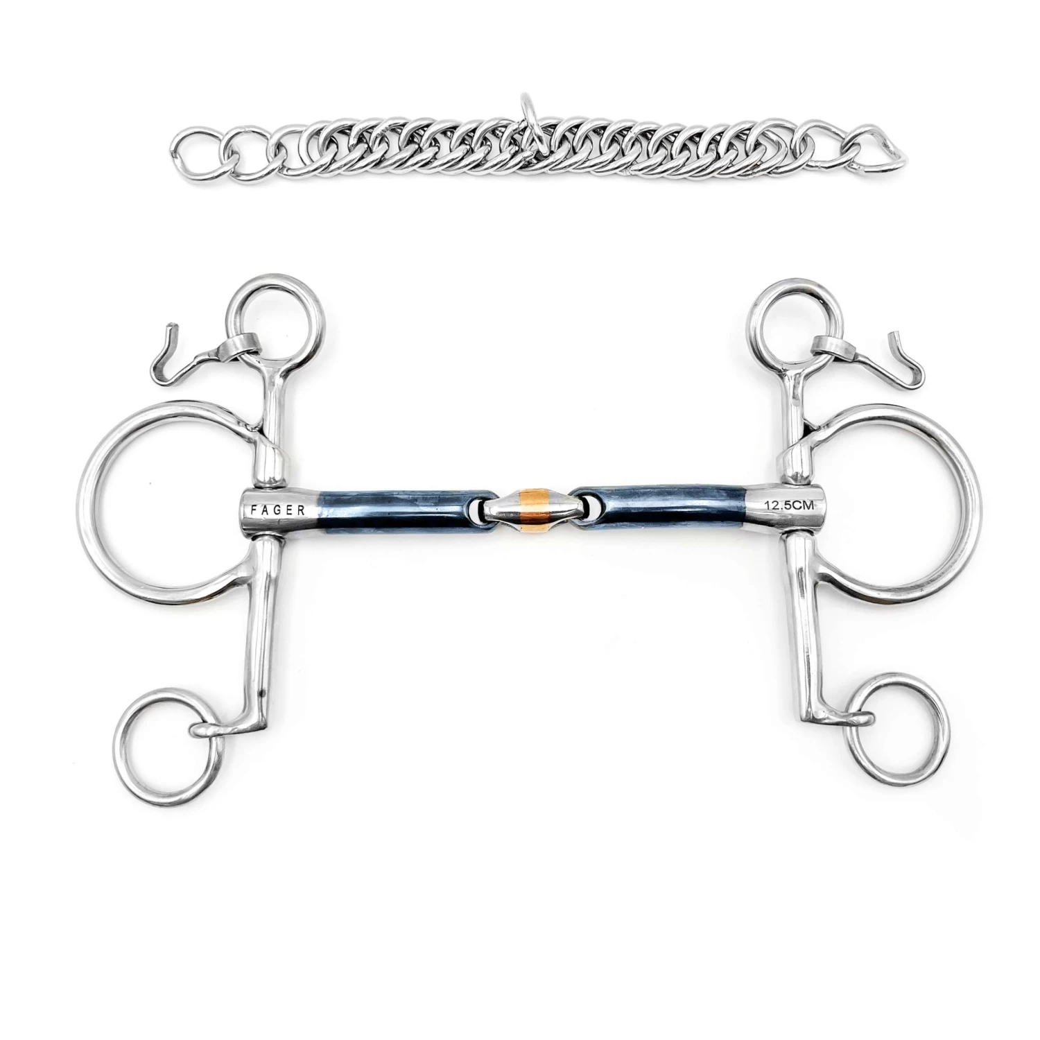 Fager John is a Double-Jointed bit. Our bits are designed to have a 100% smooth surface, including around the joints. The joints are designed and constructed to ensure they never push against the palate or sit on top of the bars. All these clever features result in an extremely comfortable bit which naturally fits the contours of the tongue.