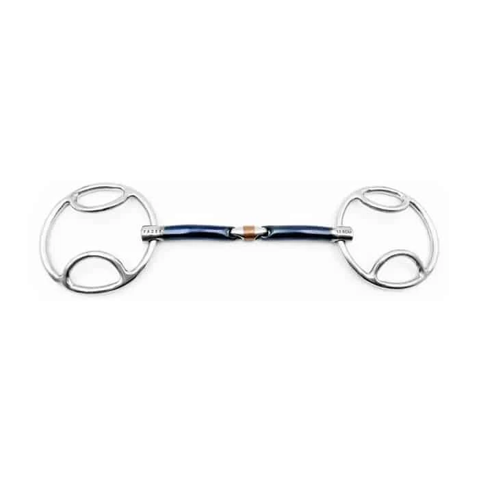 A Beval bit has a similar effect to a 2½ & 3 Ring Snaffle, but has a softer effect and less leverage. Gives a flexible, soft feeling in the hand.This bit can be used with the reins in multiple positions depending on what effect you’d like from the bit.