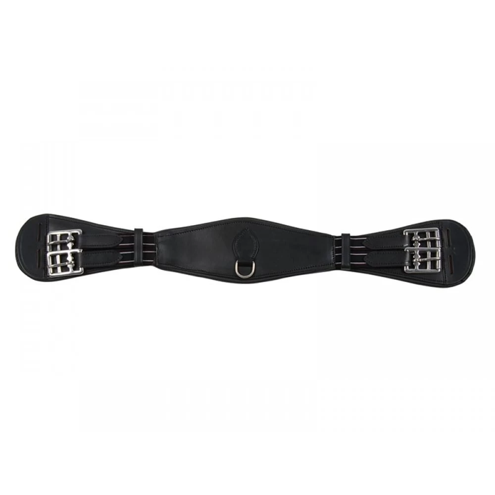 Comfortably contoured dressage girth with double elastic at both ends, center D-ring, stainless steel hardware and roller buckles.