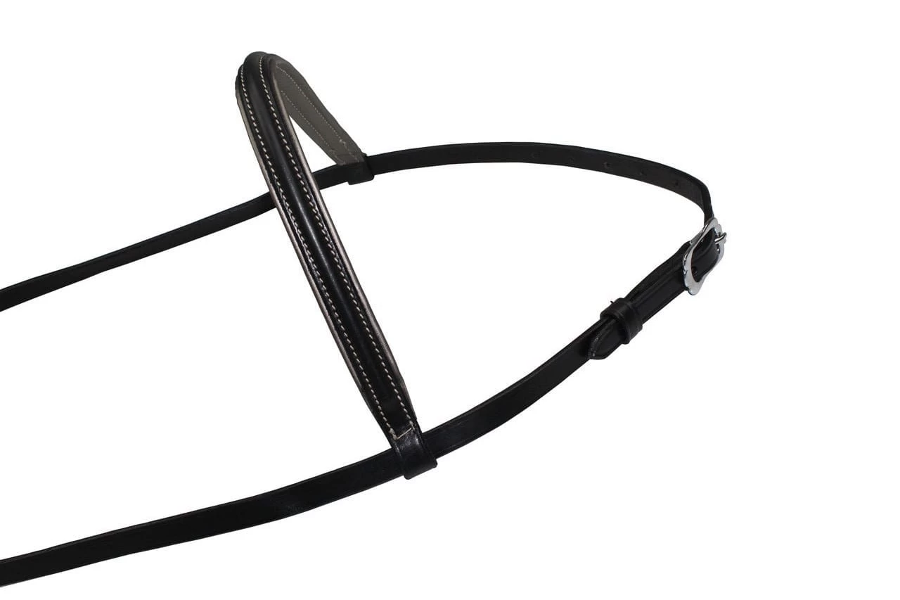 This Royal Bridle is underlaid with anthracite padded leather on the browband and noseband. The stitching on the browband and noseband is anthracite to match the padding.