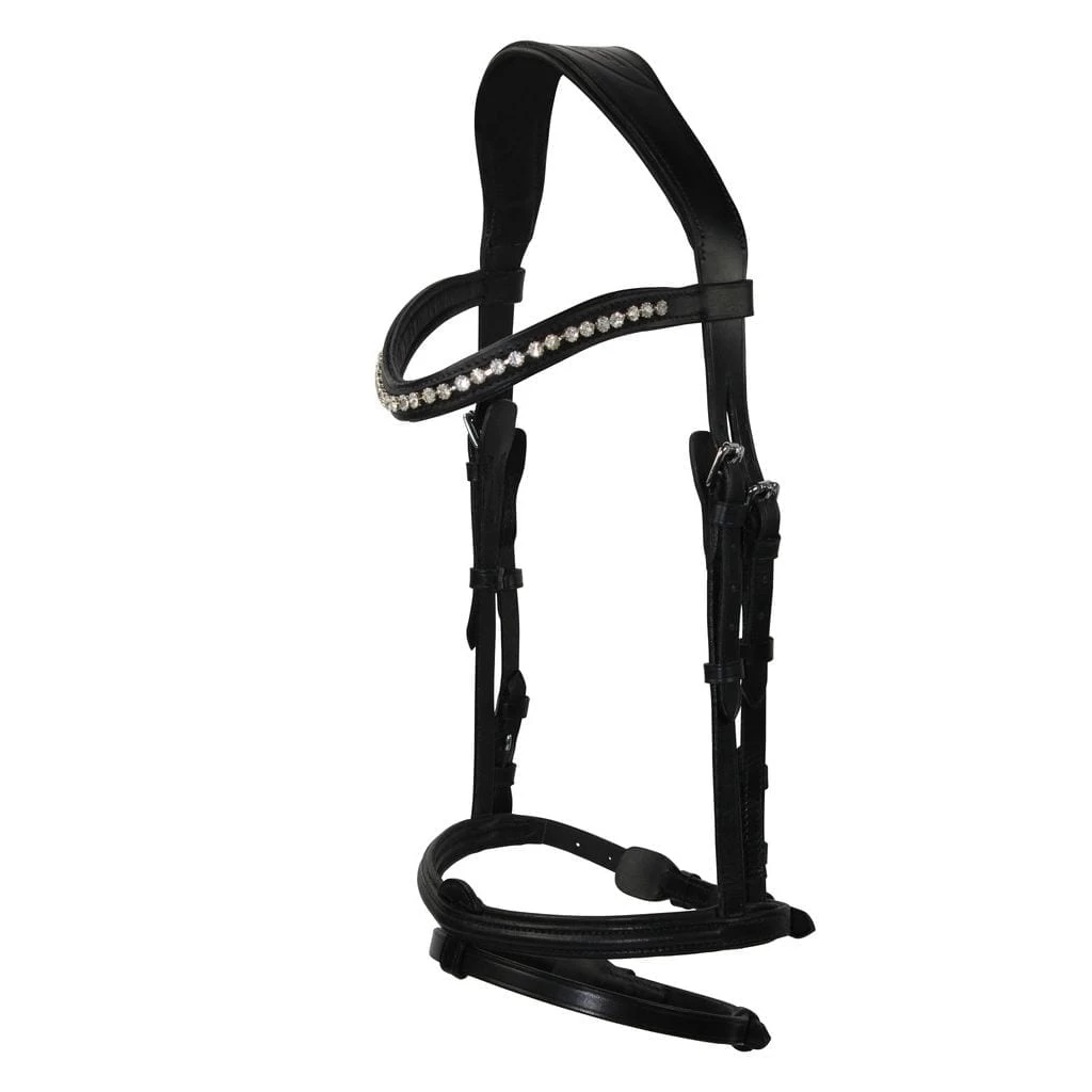 - The noseband has been integrated with the headstall with buckle guards to avoid excess rubbing or pinching to the horse. It also allows for quick access to interchange and customize pieces of the bridle. Specific nosebands in this collection may also come in a glossy black option.