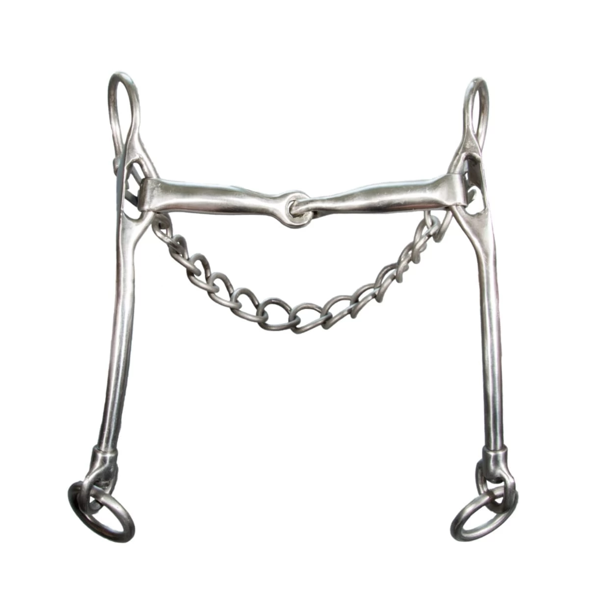 Side rings shaped to prevent pinching the horse, and improving the riders signals. The chain can be detached in both sides.