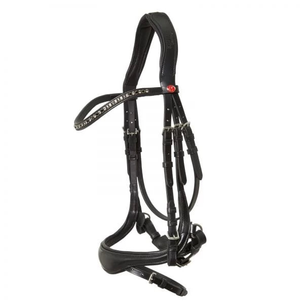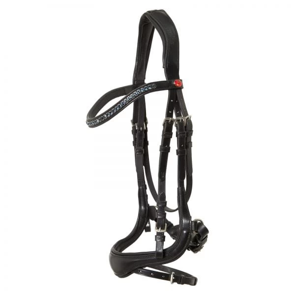 The crown has an anatomic fit and is cut away at the ear to allow for extra movement in this sensitive area, and to reduce poll pressure. To further increase comfort, the crown and noseband are softly padded. A special feature of this new snaffle bridle is the anatomically shaped noseband with intregrated flash strap. The recessed flash strap is fully removeable without leaving a loop, giving a cleaner look when the flash is not required. The bridle comes with a beautiful curved browband adorned with crystals in the colour combination of your choice.