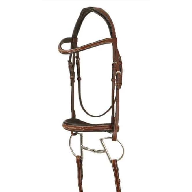 The Manchester Anatomic Hunter Bridle features a 3/4” curved padded browband, and a 1” curved padded traditional noseband. With 5/8” x 54” raised fancy stitched laced reins.