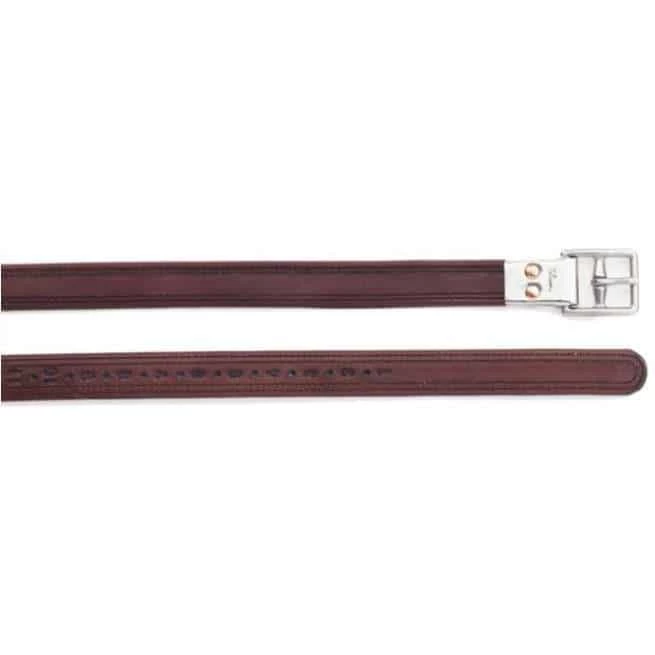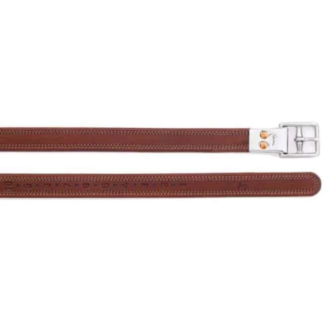 Glove soft buffalo leather stitched over a Biothane® core with clasp end. Improved curved buckle design for less bulk under the rider’s leg. Punched in with half inch holes.
