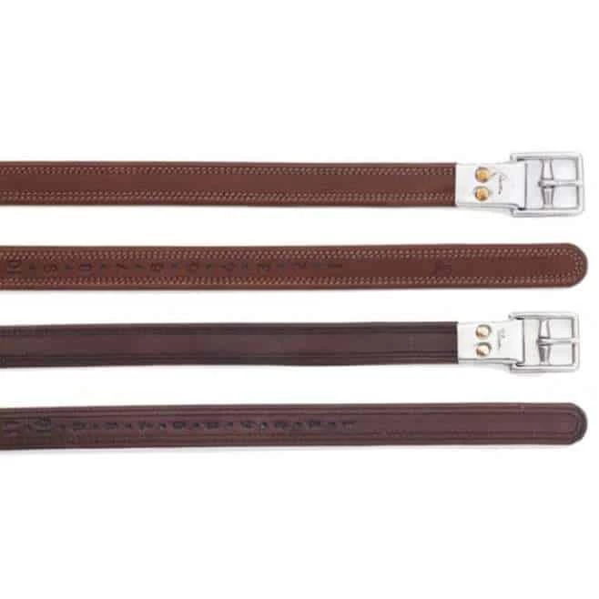 Glove soft buffalo leather stitched over a Biothane® core with clasp end. Improved curved buckle design for less bulk under the rider’s leg. Punched in with half inch holes.