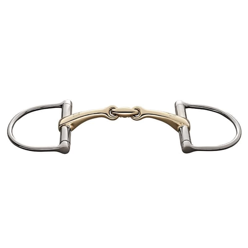 The D-Rings prevent the bit from being pulled through the horse‘s mouth. It lies steadily on the tongue encouraging a positive contact with the bit and the rider‘s hand therefore giving confidence to sensitive horses. The mouthpiece directs gentle pivotal pressure onto the horse‘s entire tongue enabling precise rein aids. It is more direct compared to a loose ring snaffle.