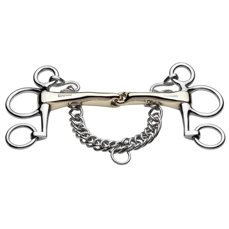 When using a Pelham the rein aid is distributed to three various parts of the horse’s head: the tongue, the poll and the lower jaw. This enables the rider to get more control over strong and powerful horses. As the chin is very sensitive and only covered with a thin layer of skin it makes sense to use a curb chain guard as a cushion.